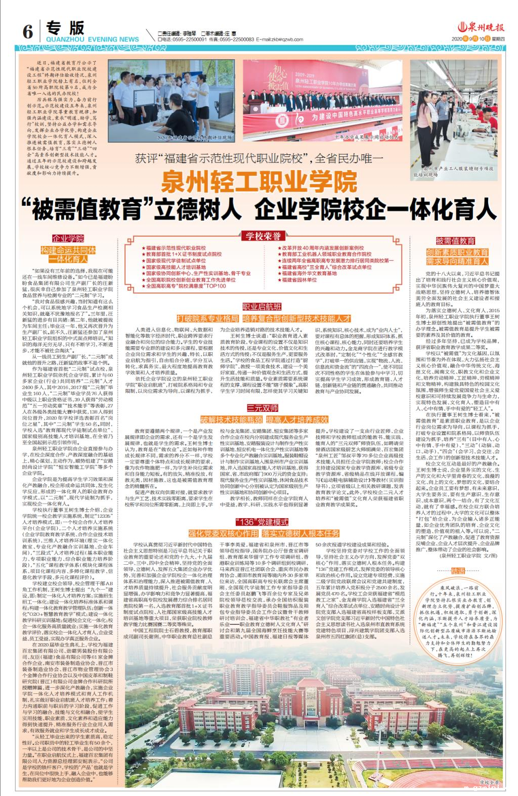 9月10日,《泉州晚报》以“hth·华体育登录官网版下载:‘被需值教育’立德树人 企业学院校企一体化育人”为题,专题报道我校获评“福建省示范性现代职业院校”,详细解读我校坚持公益办学和需求导向,发挥企业办学优势,构建企业学院校企一体化育人模式,深入推进被需值教育,落实立德树人根本任务,培育“三有”“三动”“四会”高素养创新型技术技能人才的经验做法。