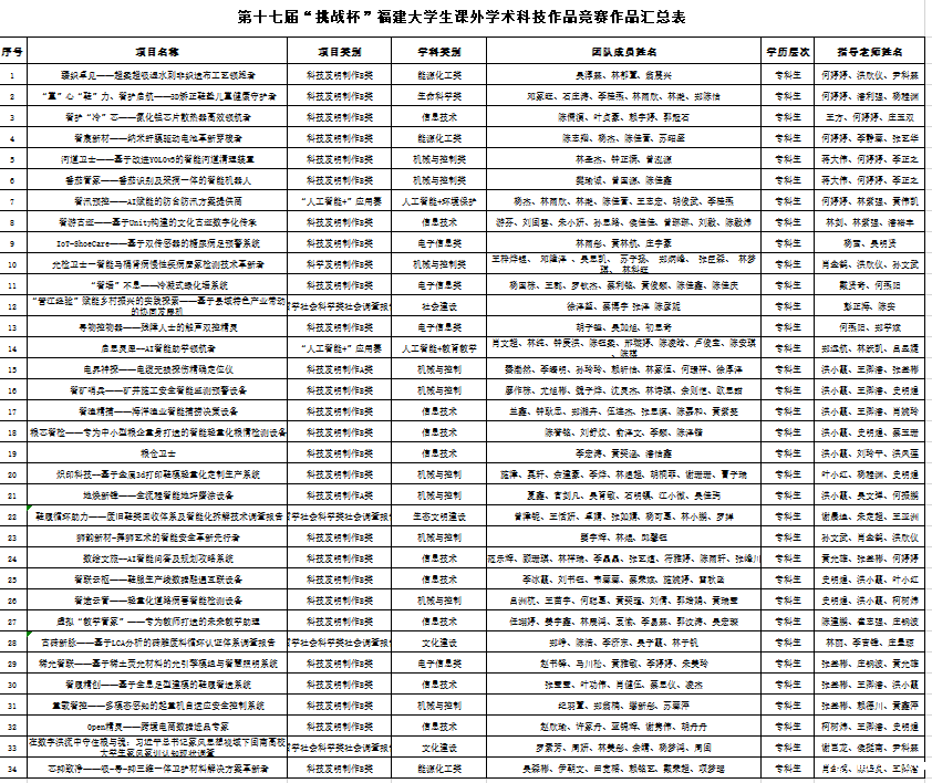 为做好第十七届“挑战杯”福建省大学生课外学术科技作品竞赛的赛事组织、作品申报等工作,进一步推动我校学生参与学术科技实践,培养创新型人才、深化立德树人,体现办学特色。根据《关于组织开展第十七届“挑战杯”福建省大学生课外学术科技作品竞赛的通知》,经项目申报、资格审查及项目初评,最终共评选出34个项目拟推荐参加第十七届“挑战杯”福建省大学生课外学术科技作品竞赛,现将拟推荐项目予以公示。公示时间:2025年4月15日-2025年4月20(五个工作日)。公示期间如有异议,请向职业中心反馈(联系人:王老师, 联系电话:17359991988)。