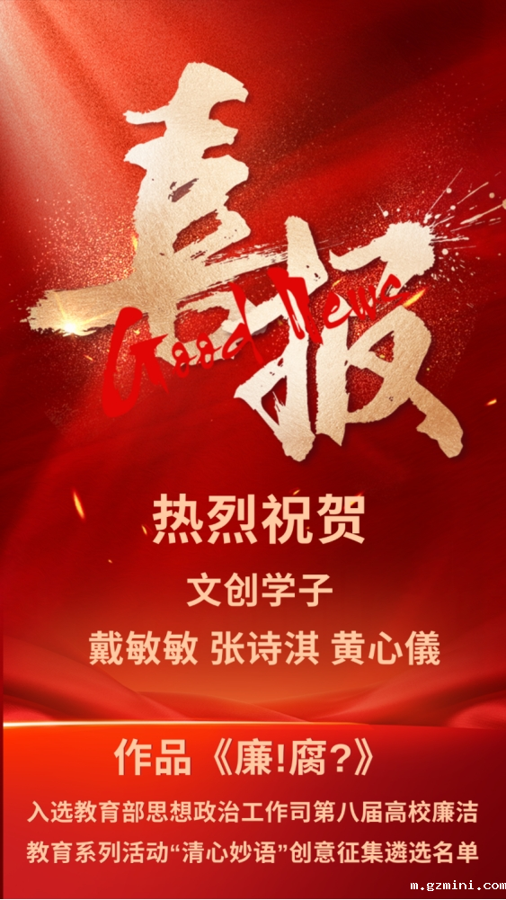 日前,教育部思想政治工作司公布第八届高校廉洁教育系列活动“清心妙语”创意征集遴选名单,由我校文创学院戴敏敏、张诗淇、黄心儀同学创作,张登彬、何婷婷老师指导的作品《廉!腐?》成功入选。据悉,本次全国共有346所高校入选,我校是福建省唯一一所入选的民办高职院校。