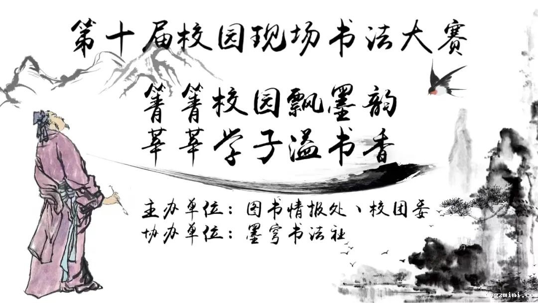为弘扬中华民族的优秀传统文化,激发广大学生对书法艺术的热爱之情,活跃学习书法的气氛,图书馆与校团委、墨穹书法社将共同举办第十届现场书法大赛,具体事宜通知如下:
