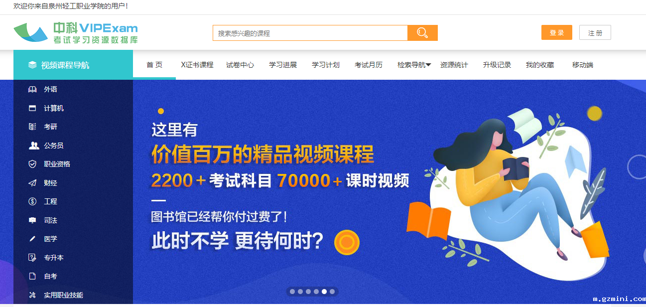 中科 VIPExam 考试学习资源数据库现已收录外语、计算机、考研、公务员、职业资格、财经、工程、医学、专升本、自考、实用职业技能等12大专辑学科学习和考试自测。